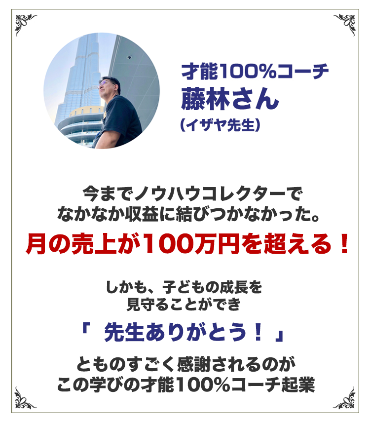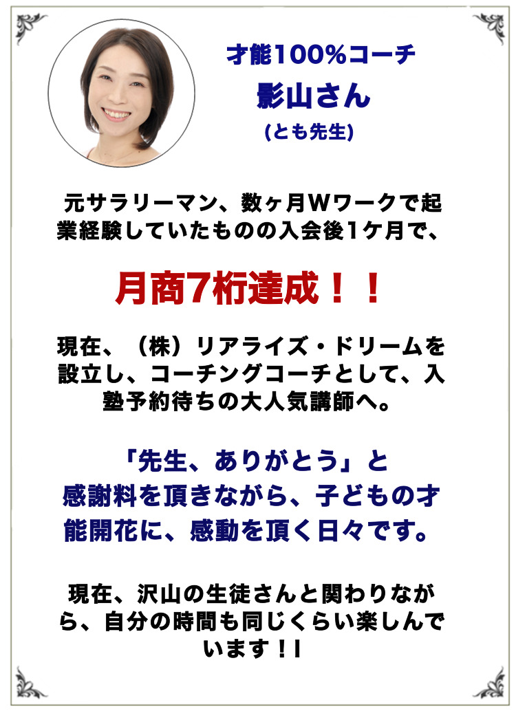 オンラインで全国の子どもたちの学びの才能を発見し、保護者、子どもたち当人から「先生、ありがとう!」の声を贈られ、成績の向上、希望校の合格、生活態度の一新に貢献しながら月収300万円を達成。