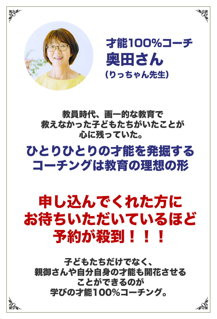 そのことをきっかけに、教育業界で15年、1200名以上の子どもたちの“学びの才能”を発掘してきた方法を『学びの“才能”100%コーチング』として提供。